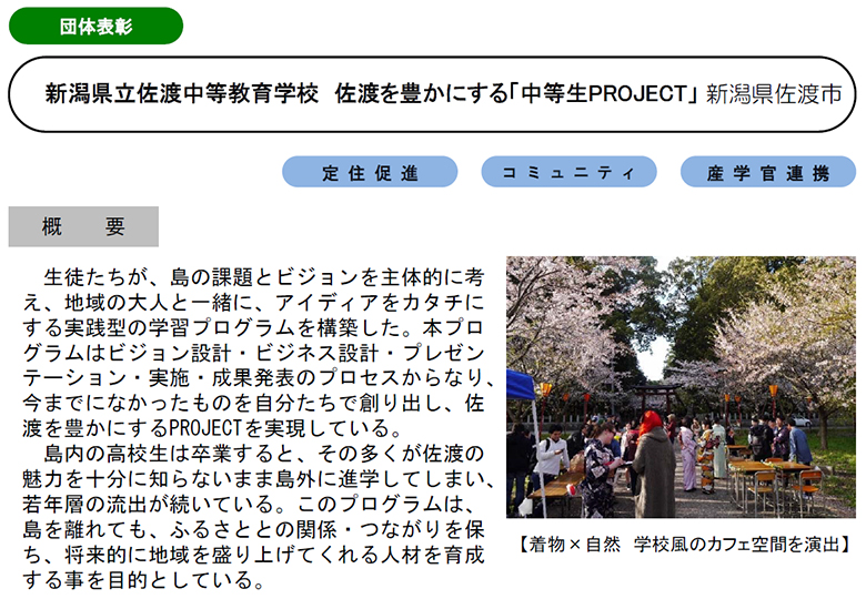 NEWS ふるさとづくりに寄与 県立佐渡中等教育学校など受賞