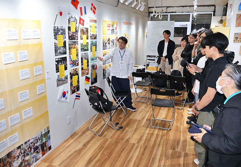 1面記事 オープニングイベントで来場者に展示内容を説明する室橋さん(中央) 日本若者協議会(室橋祐貴代表理事)は5月24日、東京都大田区内に「民主主義博物館」を開設した。国会本会議場の壁に貼ってあった模様入り…