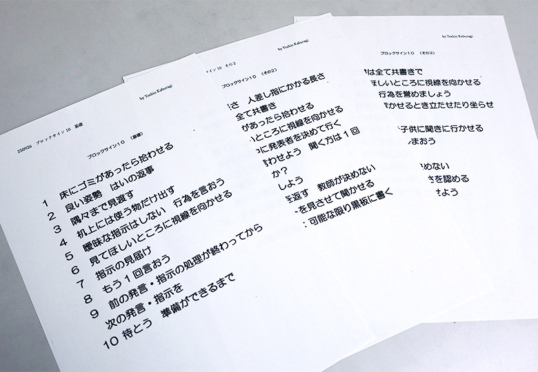 1枚の用紙(A4)にまとめられている「ブロックサイン10」 A4判1枚につき10項目 「ブロックサイン10」―。A4判1枚の用紙を使い、授業中に発揮したい教師の指導技術10個をまとめたものだ。考案し…
