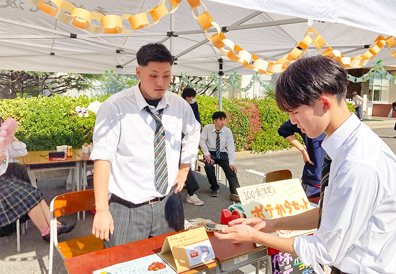 キャッシュレス決済を導入した模擬店の前でスマートフォンを操作する生徒 コロナ禍に伴う生活制限の緩和・撤廃を受け、各地の学校の文化祭が本格再開、新たに、模擬店などの支払いにキャッシュレス方式を導入する…