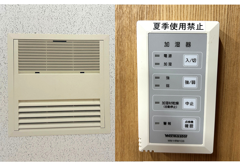 各室に配備された天井埋め込み式加湿器とリモコンスイッチ 江戸川区立篠崎小学校 近年、学校施設の新築や改修において、天井埋め込み式加湿器を標準設備として整備する事例が増加している。これは、児童生徒の健…