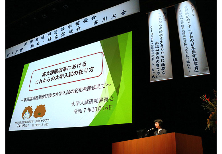 大学入学者選抜に関する調査報告を行った松陽高校の石神校長 全国普通科高等学校長会の第75回総会・研究協議会が10月16、17の両日に高松市で実施され、全国から526人の校長・教育関係者らが参集した。…