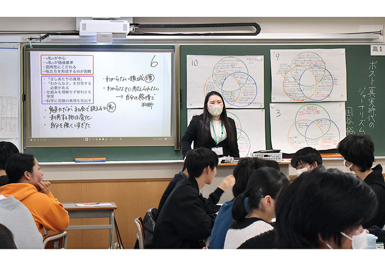 10面記事 ベン図を用いて評論の共通点を整理する授業を展開した鶴口夏菜教諭=2月6日、同校 名古屋大学附属中学・高校 研究発表会から(上) 名古屋大学教育学部附属中学・高校(柴田好章校長、生徒600人)は他者と…