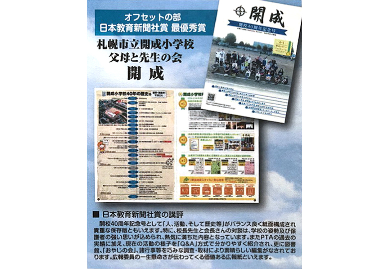 北海道版 日本教育新聞社賞・最優秀賞を受けた開成小の広報紙 札幌市PTA協議会(市P協)主催の第43回札幌市PTA広報紙まつりでは、教育長賞の最優秀賞に厚別中、日本教育新聞社賞の最優秀賞に開成小が選ばれるなど…