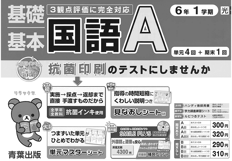 4面記事 「抗菌インキで印刷した国語テスト」(c)2021 San-X Co., Ltd. All Rights Reserved. 青葉出版 小学校用学習図書、学習教具・教材の出版・製作、販売を行う青葉出版…