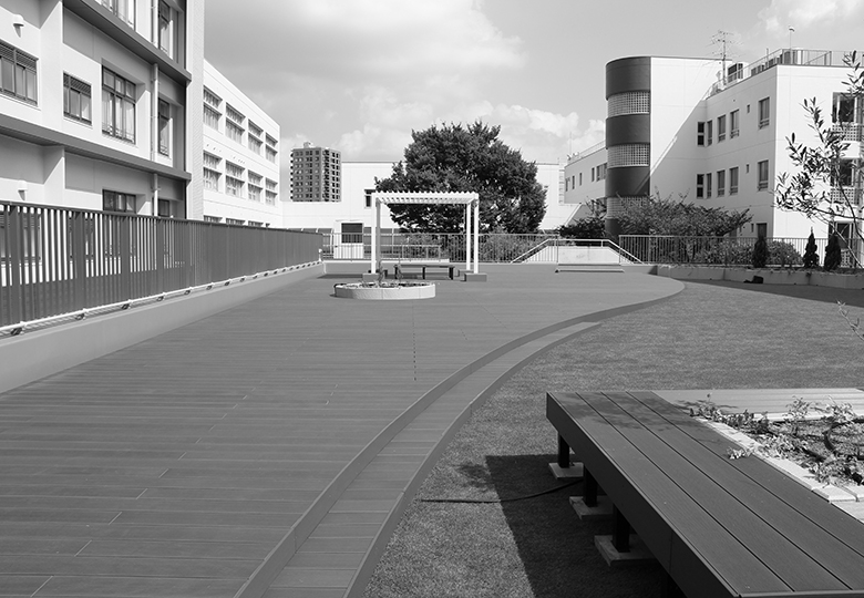 学校施設の施工例(東京:サレジアン国際学園中学校・高等学校) 再生材使用のエコマーク商品 セイキ販売 ルポウッドは、リアルな木質感を実現した環境に優しい人工木デッキ材で、天然木と比べ、経年劣化によ…