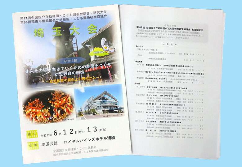 6面記事 全国国公立幼稚園・こども園長会埼玉大会提言資料、和歌山大会研究発表資料から 新型コロナウイルス感染防止のため、全国国公立幼稚園・こども園長会(会長=箕輪恵美・東京都中央区立有馬幼稚園園長)は、本年度…