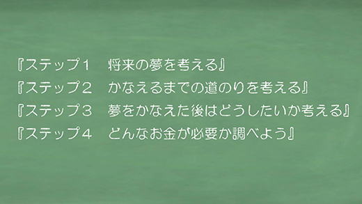 人生設計に必要なライフプランニングの重要性を分かり易く解説し、将来の進路に必要な資金について考える事を提案。親しみやすいアニメーション形式の動画で、学習活動や、コンクールへの応募準備にも活用できる。