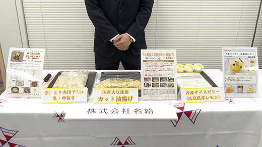 「冷凍ダイスゼリー(広島県産レモン)」のほか、姉妹品として「とちおとめゼリー」や「湘南ゴールドゼリー」など地産商品を生かしたゼリーを紹介した。「国産大豆使用カット油揚げ」は、専用工場で大豆から加工しコンタミを防止している。「学)とり肉団子 7・5グラム乳・卵抜き」は、栄養士の声から誕生したアレルギー対応のロングセラー商品となっている。
