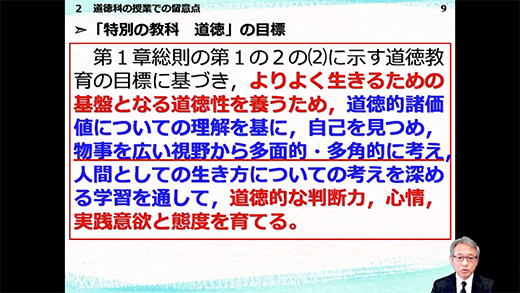たとえば多様な価値観が引き出される「臓器移植」を通して、生命、いのちについて多面的・多角的に考え、判断し、表現できるようにする。あるいは道徳科をより充実させるために、他の教育活動と関連付けることが大切になると示した。