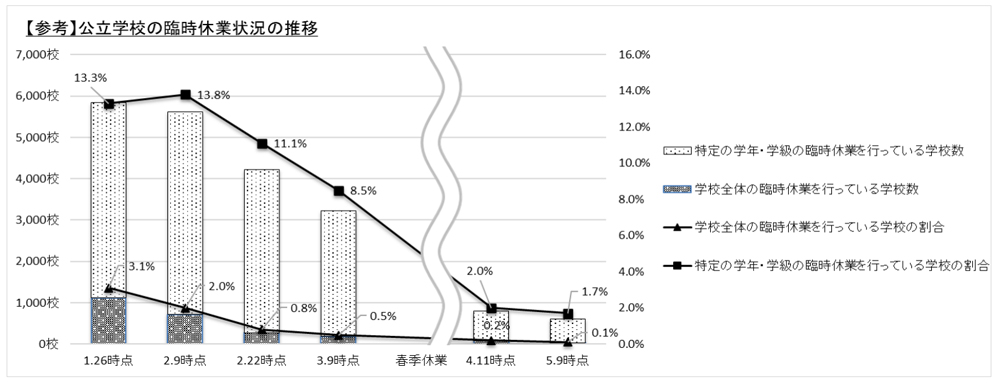それによると、今年に入ってから2月9日には学級閉鎖・学年閉鎖を行っていた割合は13・8%に達した後、低下を続けている。前回は4月11日時点で集計し、2・0%にまで下がった。今回はさらに、0・3ポイント下げている。公立の幼稚園、小・中学校、高校、特別支援学校について調べている。