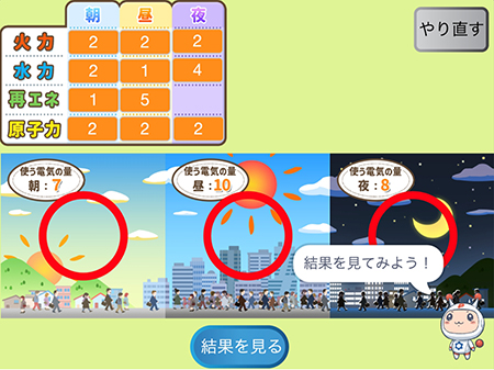 火力、原子力、水力、再生可能エネルギーなどの発電方法の特徴をSDGsの観点からも学習できる。その上で、これらの発電方法を長所や短所を考えて組み合わせる教材となっている。組み合わせた発電方法は、朝・昼・夜で変化する電気の必要量を満たしているか、「CO2」「費用」「安定性」の3つの観点からみてどうなのかをゲーム感覚でシミュレーションできる。こちらも「Scratch(スクラッチ)」で、子どもたちが直感的に操作でき、授業用のワークシートや指導案もそろっている。