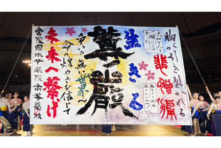 第18回大会で優勝した水戸葵陵高校の作品(書道パフォーマンス甲子園実行委員会提供) 紙製品出荷額が多く「日本一の紙のまち」をうたう愛媛県四国中央市で今夏、第18回全国高等学校書道パフォーマンス選手権...
