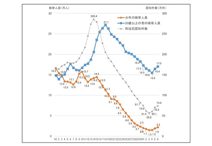 警察庁は20歳未満の人を「少年」と定義して、集計している。刑法に違反した少年は平成16年以降、減る傾向が続き、令和3年には戦後最少となった。