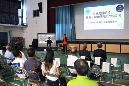 講演する宇田川教諭(中央) 宇田川・大阪府立吹田支援学校教諭  令和5年に第65次南極地域観測隊(夏隊)に同行した大阪府立吹田支援学校教諭の宇田川順子さんが9月27日、大阪府吹田市などが主催する「20...
