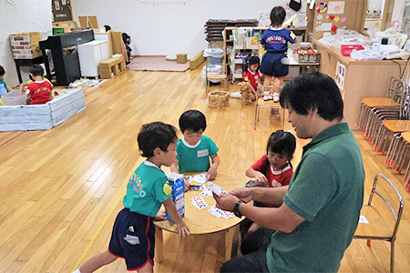 4歳児の保育室では、トランプをする子、ブロック遊びをする子、ゆったり過ごす子など、それぞれが好きなことを楽しんでいる 第16回幼児教育実践学会 (下) 認定こども園立花愛の園幼稚園の口頭発表 「一人...