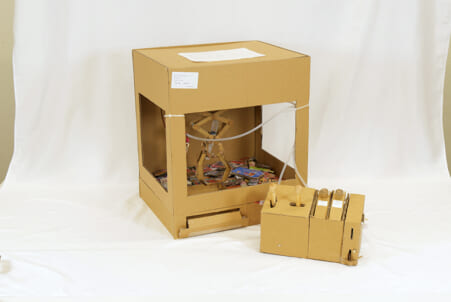 この作品は、体の不自由な人が楽しく遊べて買い物できるように、クレーン型のマジックハンドを段ボールで使ったもの。工夫したところは、電気で前後左右に動かし、注射器をポンプとして利用して、上下開閉できるようにしたことだという。