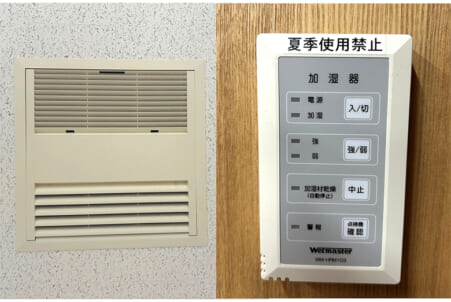 各室に配備された天井埋め込み式加湿器とリモコンスイッチ