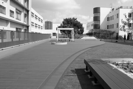 天然木のデッキ材をルポウッドにリフォームすることにより、リフォーム後のメンテナンスコストの軽減が見込める。天然木の場合、数年に一度の防腐処理および塗装が必要になるが、このようなメンテナンスが不要になる。また、無垢形状になっているため同種の中空材に比べ局部的な衝撃による割れに強く、R加工や斜めカットが可能。デッキの形状を自由にできるのも採用の多い理由だ。表面にリブ加工を施し汚れやキズが目立ちにくく、小さな傷であればサンドペーパーで補修可能。このような特長からも不特定多数の往来が想定される教育施設の渡り廊下やデッキ材として最適なため、幼稚園や保育園や小中学校での採用が増えている。