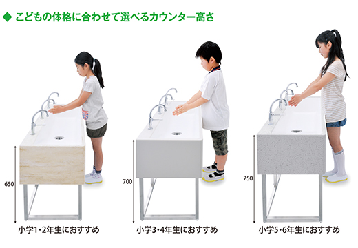こだわりの一つが、小学生から大人まで快適に使えるサイズ設計。無理なく水栓に手が届く奥行設定(550mm)と、バケツも置ける十分な深さ(シンク深さ230mm)を備えており、気持ちよく手洗いができる。カウンターは3人用(幅1500mm)と5人用(幅2500mm)の2種類で、3人用×4台や5人用×2台など複数台組み合わせて設置することもできる。しかも、カウンターの幅は1mm単位で調整できるため、設置場所に隙間をつくらずにぴったり収めることも可能だ。