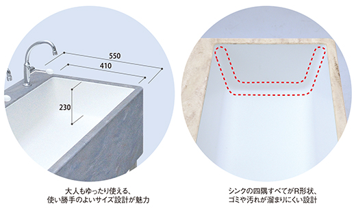 素材はキッチンの天板にも使用されるアクリル系人工大理石となっており、耐久性・耐候性に優れている。また、継ぎ目のない仕上がりのため、日常の汚れも水拭きやキッチン洗剤を浸した布で拭くだけと手間がかからない。しかも、シンクの四隅はすべてR形状となっており、ゴミや汚れが溜まりにくく衛生面でも優れている。