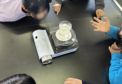 しかし、そんな子どもたちが「えっ?」「うそ!」とドキドキしたり、ワクワクしたりする姿を見せるときがある。それが、火を扱う実験である。火を扱う実験の前には火の消し方や「理科用カセットコンロ」の扱い方をみんなで学び、自分たちが実際に点火したり消火したりできる。火は子どもたちにとっては怖いものであるが、扱うことができると満足感を得られるようである。