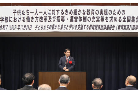 集会に出席した松本洋平・文部科学大臣は、SNSを通じて多くの教員から声が寄せられていることを紹介し、「現場主義を徹底していく」と挨拶した。
