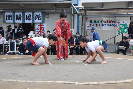 校内の土俵で相撲大会 立ち合いの作法など学ぶ