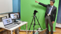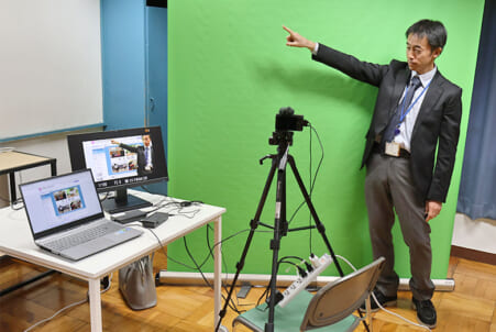 撮影時に使うグリーンバックの前で、説明に当たる市職員。左端のパソコンの画面にある画像と合成した画像を右側のモニターに映し出している=戸田中学校のパソコン室(メディアルーム)で  埼玉県戸田市教委はIT...