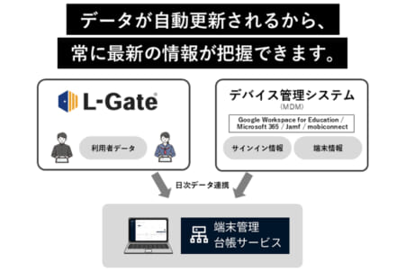 このL-Gateに、GIGAスクール端末の管理を効率化する「端末管理台帳サービス」がオプションとして追加された。本サービスは、L-Gateのアカウント情報とデバイス管理システム(Microsoft 365・Google Workspace for Education・jamf・mobiconnect)の情報を連携させ、PCやタブレットの台帳を作成することができる。これにより、端末の利用状況や管理情報をリアルタイムで把握し、運用の負担を軽減する。端末とユーザーIDも自動紐付けされ、学校・学年・氏名・ログイン履歴を一覧で確認可能。シリアル番号やOSバージョンなどの詳細情報も取得され、管理台帳に自動反映される。また、カスタム項目の追加やCSVによる一括登録・データ出力も可能で、自治体や学校独自の管理ルールに柔軟に対応できる。