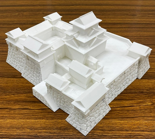 松山南高等学校自然科学部の皆さんのご協力で、令和5年度に松山城のジオラマ製作を開始した。設計の知識がない高校生が工事の資料やドローンの写真などを頼りに、支援ソフトで図面を作成し、3Dプリンターで立体化した。でき上がった試作品を松山盲学校の皆さんのご協力で触察してもらい、利用者の視点で、東西南北の点字情報を追加するなど実用性を高め、天守や石垣、櫓などを再現した「手で見る松山城」が完成した。
