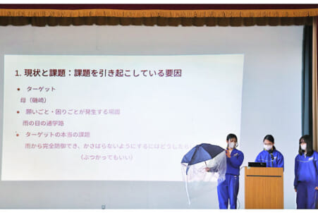 雨の日の通学路の課題を解決するため、「てるてる傘」を開発した生徒たち。発表会で使う様子も披露した 神奈川県小田原市教委は、地域を拠点に教科横断的な思考で探究的・創造的な活動を展開する「小田原版STE...