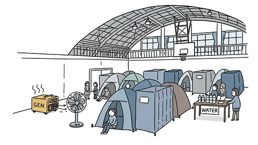 いまだ約2割にとどまる体育館の断熱改修と空調整備は、避難者の健康を守る基盤となるため、なるべく早期に整備率を高めていく必要がある。災害はいつどんな季節でも起こるかも知れず、夏季の猛暑下では熱中症リスクが高まり、冬季には低体温症や感染症拡大の恐れがあるからだ。