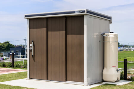 建築物にも採用されているガルバリウム鋼板を使用し、高い耐久性を持つ「エルモ」シリーズでは、震度6弱程度の揺れが発生すると自動で解錠する地震解錠装置(機械式で電源不要)や、災害時に防災用品を取り出した後の空間を仕切ることで、物置内に更衣室や簡易トイレなどのプライバシー空間を作ることのできる間仕切りセット、雨水を貯めておき緊急時のトイレ用水等として利用できる雨水タンクなど、さまざまな防災倉庫として利用できるオプションがラインナップされている。