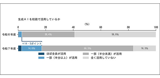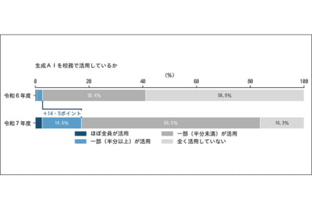 令和6年度と比べ6ポイント以上伸びた項目では、生成AIの校務活用が最大の14・5ポイント増だった。令和7年度時点では、「ほぼ全員が活用」が2・6%、「一部の教職員(半分以上)が活用」が14・6%で、合わせて17・2%が一定程度活用していた。