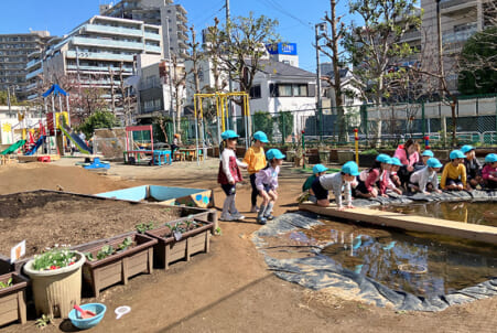 土山を移動して畑を作り、「おさかな池」を構築した現在の園庭 東京・江東区立なでしこ幼稚園 (上)  豊かな園庭環境は、子どもたちが経験できることが増えて遊びが充実し、たくさんの学びにつながっていく。東...