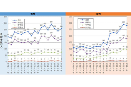 厚労省と警察庁は27日、昨年、自ら命を絶った小・中学生、高校生の合計は538人で過去最多を更新したとの確定値を公表した。2年連続で女子が男子を上回った。男子は258人、女子は280人だった。