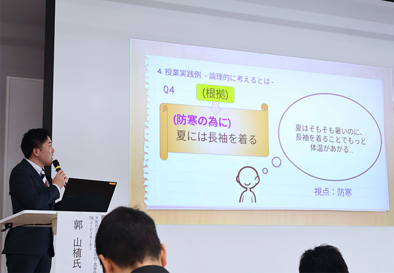 模擬授業で、論理的な文章に関して解説する郭教諭=12月6日、水都国際中学校・高校 文科省がセミナーを開催 探究や協働的な学びを通じ国際的な視野を育む「国際バカロレア(IB)」教育推進のため、文科省は…
