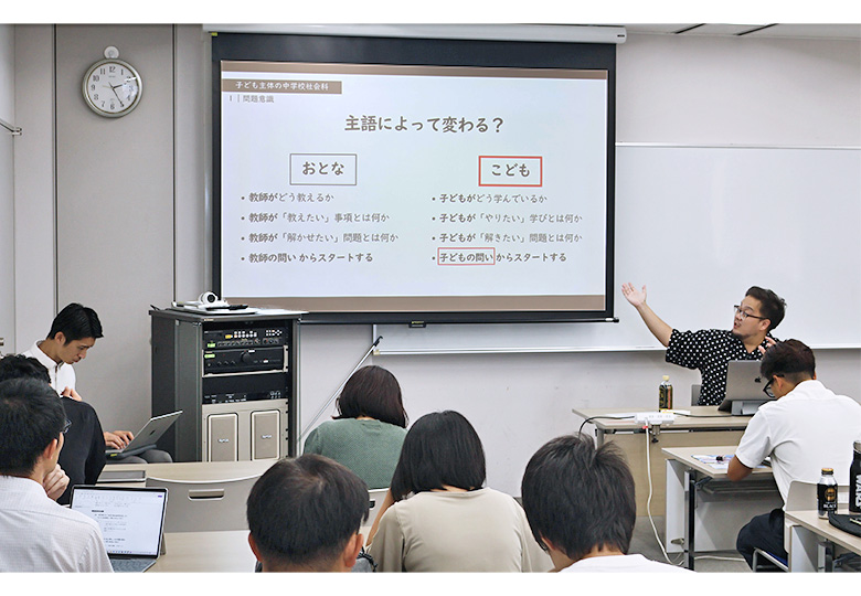 本実践について8月下旬に行われた第5回関西教育工学研究会で発表した辻教諭(右奥) 辻 常路 兵庫県川西市立明峰中学校教諭 「社会科で取り組むべき『子ども主体の学び』とは?」―。こうした問題意識を持ち…