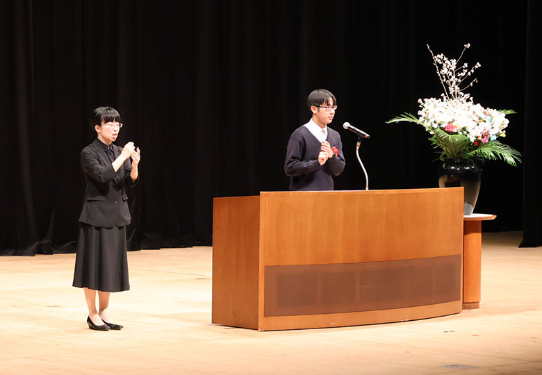 身ぶりを交えて作文を披露した寺岡さん(右) 東京・八王子市 八王子市民生委員児童委員協議会(東京都)が主催する中学生社会福祉意見発表大会は本年度、第25回の節目を迎えた。子どもの考えを知ろうと、委員…