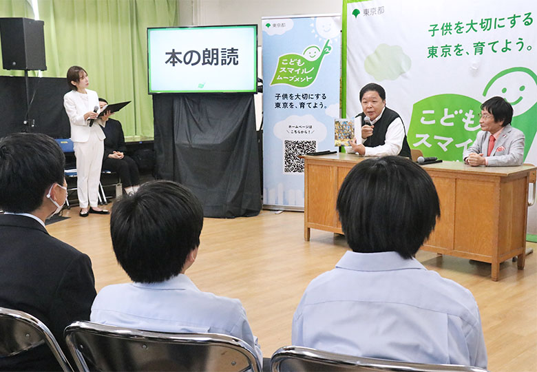 「の」を朗読する伊集院光さん 東京・足立区立第十三中学校 タレントの伊集院光さんと教育評論家の尾木直樹さんをゲストに招いた特別授業が1月27日、東京都足立区立第十三中学校の知的障害の特別支援学級で開…