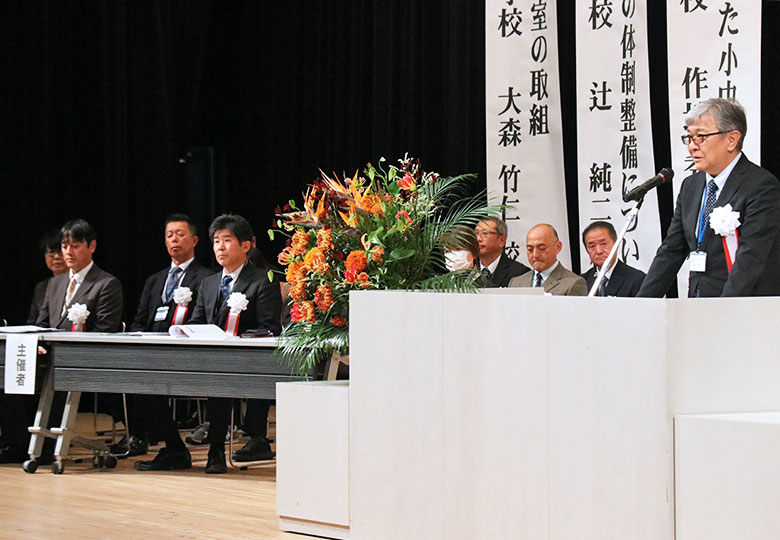 開会のあいさつをする大関浩仁会長(東京都品川区立第一日野小学校校長、右端) 全国特別支援学級・通級指導教室設置学校長協会 関東甲信越地区研究協議会 全国特別支援学級・通級指導教室設置学校長協会は14…