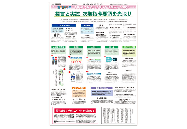 日本教育新聞は4月に紙面を改めます。「次期学習指導要領を先取り」を柱に据え、提言型の記事と実践事例を多く盛り込んでいきます。中央教育審議会の審議経過も引き続き、重点的に掲載します。学習指導要領改訂に…