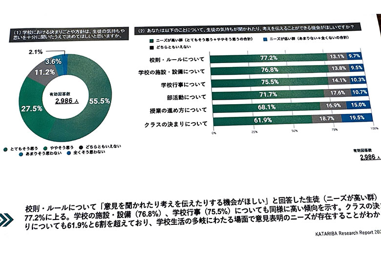 NPO法人カタリバが、全国の中高生約3千人に実施した学校での意見表明に関する意識調査の結果をまとめた。生徒が「自分たちの考えを伝えたい」と感じているのは校則・ルールが77・2%に上った他、施設・設備…