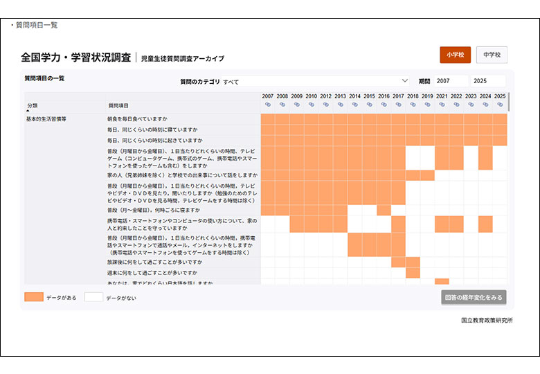 国研 国立教育政策研究所は、全国学力・学習状況調査の質問調査について、過去の回答を一覧で閲覧できるウェブサイトを公開した。児童・生徒の生活習慣や情報端末の活用状況、学校運営の取り組みなどについて平成…