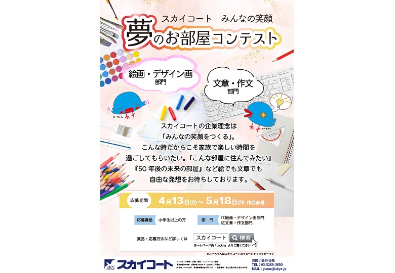 △課題「『夢のお部屋』を自由な発想で、絵やデザイン、文章で表現する」 △対象=日本在住の小学生以上 △応募=〔絵画・デザイン画部門〕八つ切りまたは四つ切りの画用紙、パソコンの場合はA4またはA3でも可…