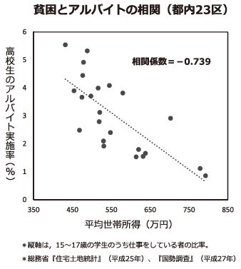 低所得世帯の高校1年生の3人に1人がアルバイトをしているという(公益財団法人「あすのば」)。学費や生活費を稼ぐためで、遊ぶ金目当てではない。貧困とアルバイトの相関は、都内23区の統計からもうかがわれ…