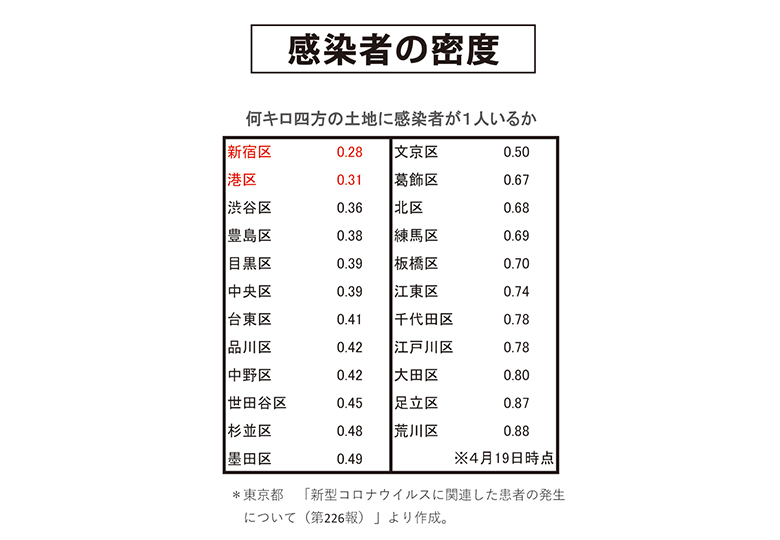 2面記事 コロナウイルス感染者の増加が止まらない。東京都では4月20日時点で3184人の感染者が確認されているが、これだけだと状況の深刻さをイメージしにくい。怖いのは感染者との接触であるので、単位面積当たりの…