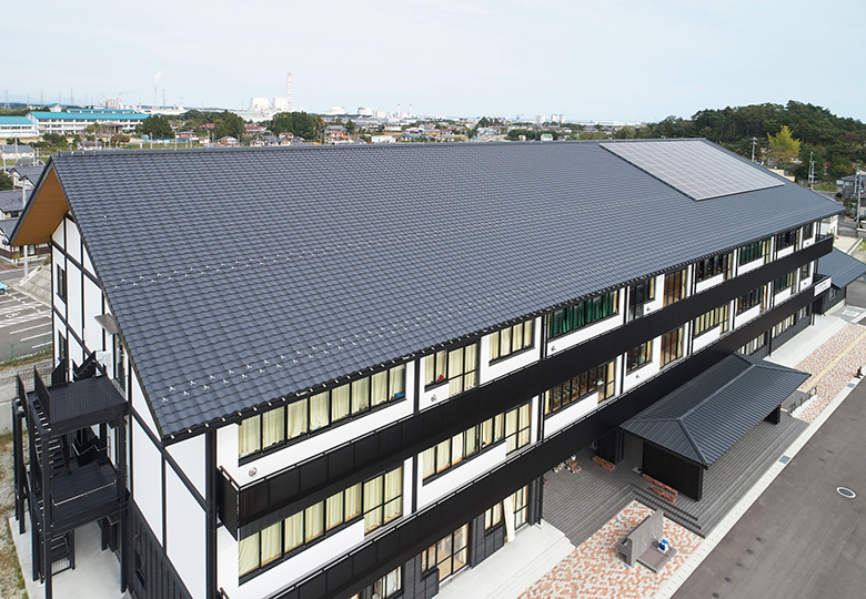 ケイミュー(株)が取り扱う「ROOGA」は、陶器瓦のような重厚感を持ちながら、地震時の建物の揺れを軽減する軽量性を兼ね備えた複合素材の屋根材だ。一般的な陶器平板瓦の約半分ほどの軽さを誇り、建物への負担が低減できるほか、屋根材を一枚一枚しっかりと釘で留める施工方法で、強風時にもズレや飛散を防止。耐衝撃性にも優れ、台風や突風時に飛来物が当たっても割れにくく、飛んだ破片で怪我をするといった二次被害も防ぐことができる。