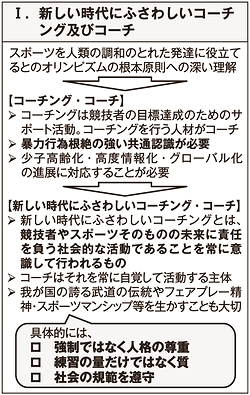 3面記事 スポーツ指導で文科省有識者会議が報告 6月28日に開かれた最終会合の議論を経て取りまとめられた、文部科学省の「スポーツ指導者の資質能力向上のための有識者会議報告書」。当初の目的である「暴力に頼らない…